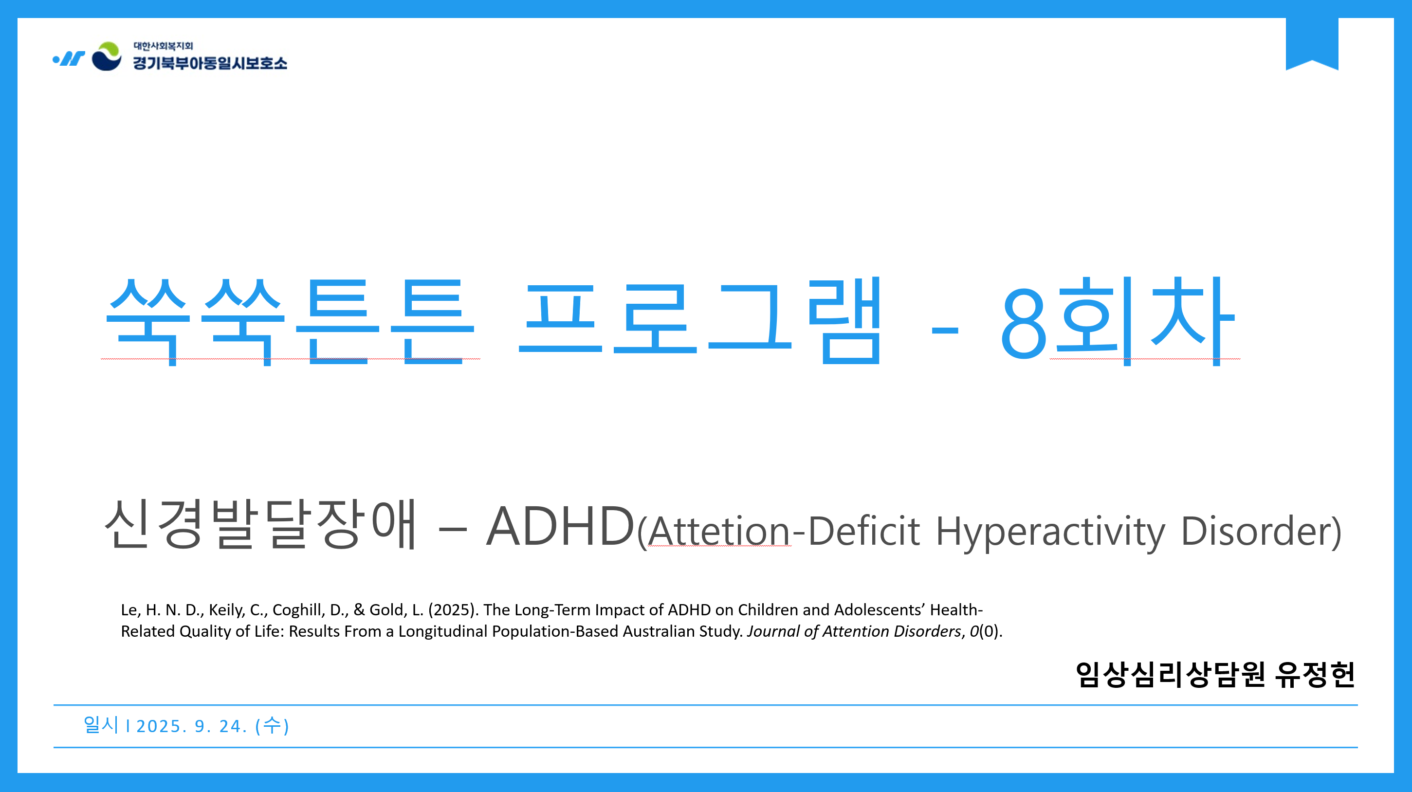 ³¡À¸·Î, ADHD¸¦ ¾Î°í ÀÖ´Â ¾Æµ¿·Ã»¼Ò³âÀÇ °Ç°°ü·Ã »îÀÇ ÁúÀû Àå±âÀû ¿µÇâÀ» ´Ù·é ³í¹®{Le, H. N. D., Keily, C., Coghill, D., & Gold, L. (2025). The Long-Term Impact of ADHD on Children and Adolescents’ Health-Related Quality of Life: Results From a Longitudinal Population-Based Australian Study. Journal of Attention Disorders, 0(0).}µµ ÇÔ²² »ìÆìºÃ½À´Ï´Ù.